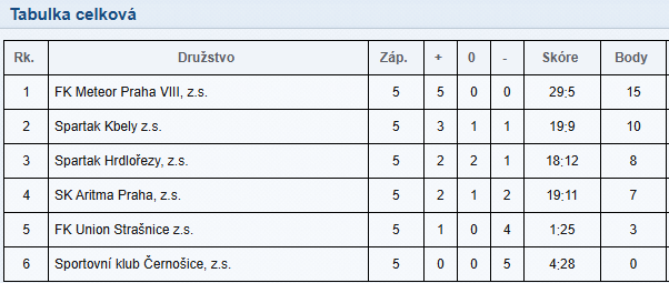 | 9. | FK Klánovice | 11 | 23:25 | 14 |